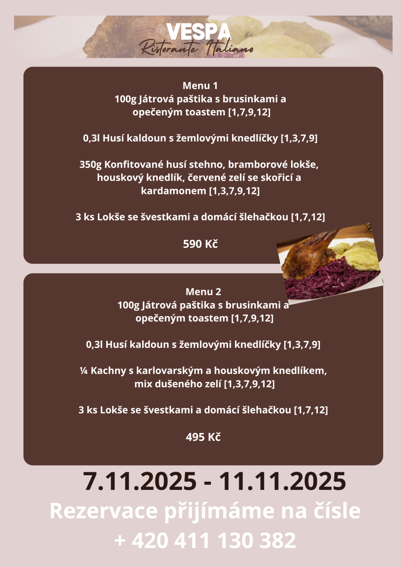 +420 411 139 382 nebo emailem na adrese: restauracevespa@gmail.com.